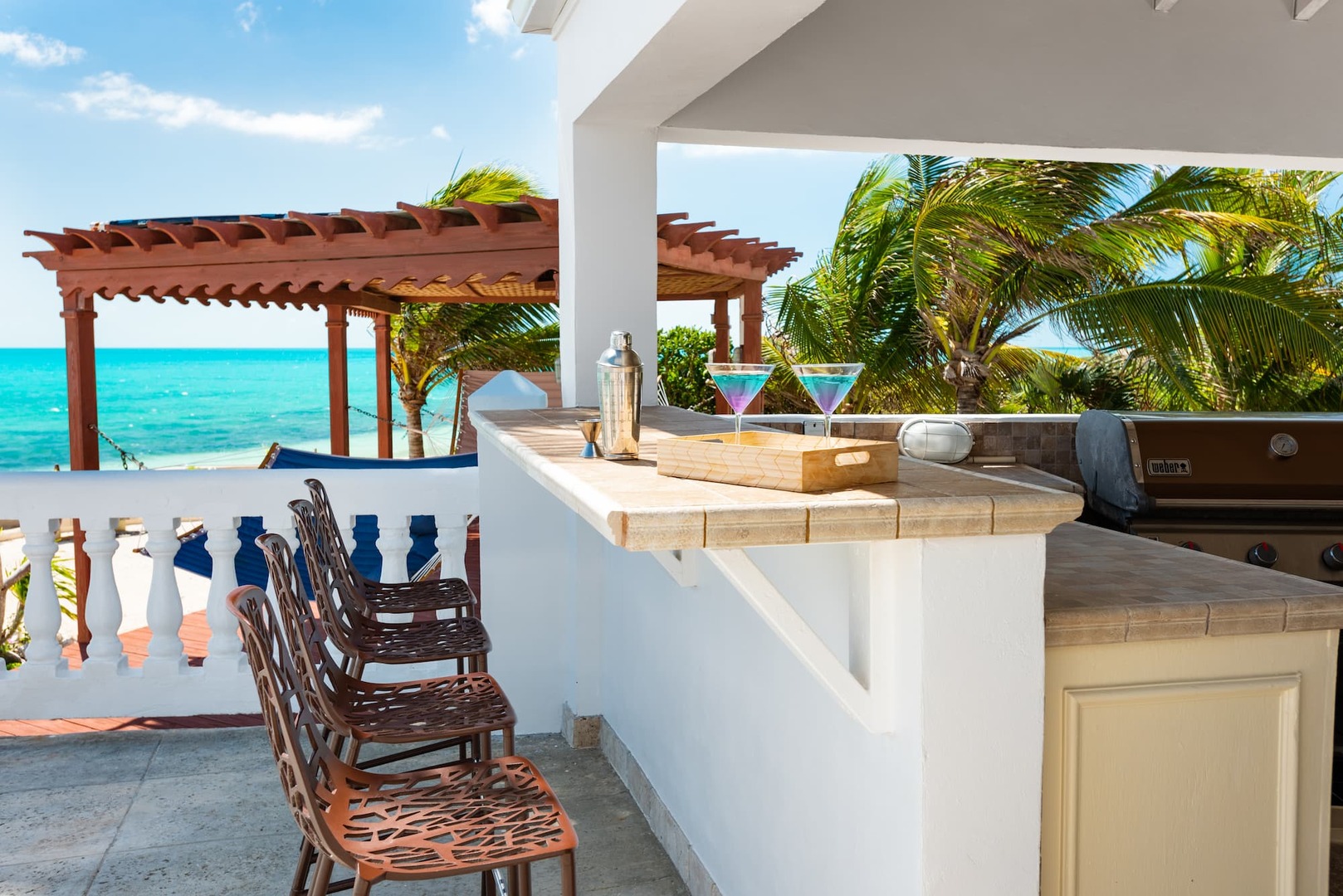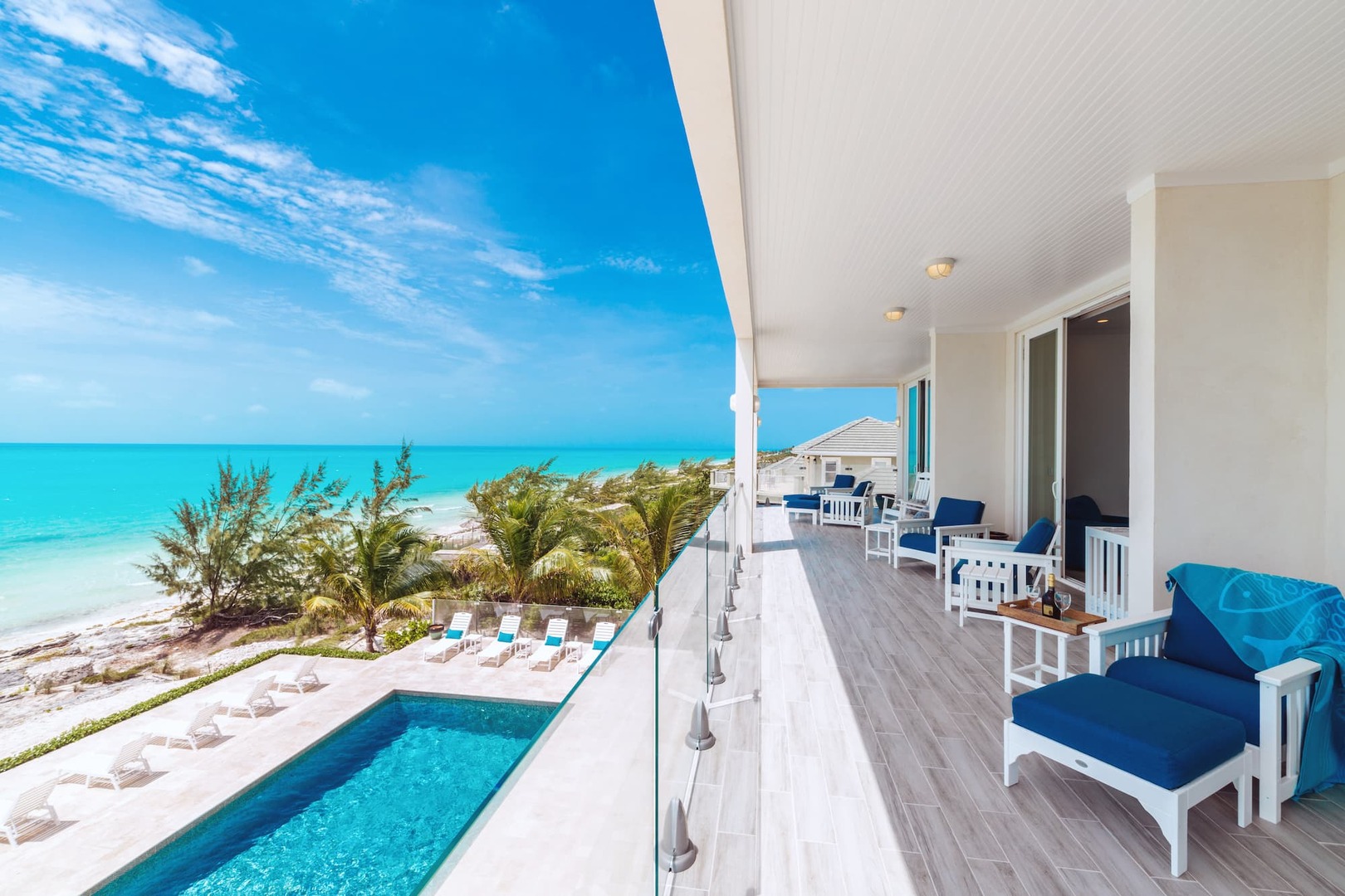 This expansive beachfront estate features a heated infinity pool, outdoor wet bar, and hammocks strung between palms. With two living rooms, spacious oceanview suites, and a rooftop terrace perfect for stargazing, Conched Out accommodates 14-16 guests. The property even includes a basketball court for active groups.