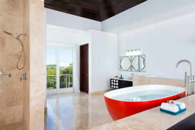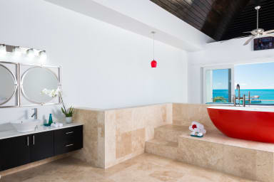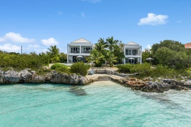 Miami Vice One shares a gated driveway and paddleboards with its sister villa next door but maintains privacy thanks to thoughtful design and a dividing wall between pools. Wade just a few steps into the bay to explore calm waters by kayak or paddleboard, relax in the oversized soaking tub, or enjoy a beachfront moment on a small stretch of white sand tucked just around the bend.