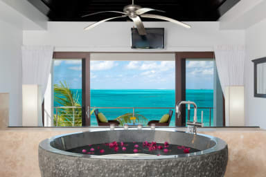 The comfortable and spacious beach-level living room features a 40” Google TV with web capabilities and a fantastic bay view. The kitchen is fully equipped and ready to grill freshly caught fish, or guests can use the BBQ grill on the pool patio. Take a dip in your private plunge pool while enjoying the view. In the morning, the large master bedroom upstairs gives a scenic view of the sunrise over Grace Bay. While enjoying the calm rolling bay at a distance, guests can enjoy soaking in the large granite tub. The upstairs balconies that look over either Grace Bay or Turtle Cove Marina are perfect for enjoying a romantic moment or with a tropical beverage in hand. Invite in the ocean breeze through the master bedroom by opening both patio doors to create a perfect Caribbean retreat.