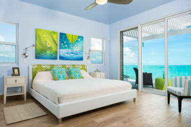 The open chef’s kitchen leads to a covered grilling terrace, complete with an outdoor table -perfect for dining al fresco. The indoor dining table rivals the best table in any fine restaurant and seats ten comfortably. The two indoor seating areas on the ground floor offer vistas of Long Bay through the floor-to-ceiling windows and sliding glass doors, or you can watch television on the 52-inch flat-screen TV. There will be no fighting over bedrooms in this modern, elegantly furnished villa; each of the five bedrooms is furnished with a king-size bed, en-suite bathroom, and spectacular views of the gem-blue waters of Long Bay. Enjoy the stylish decor of this private beachfront estate inside and out.