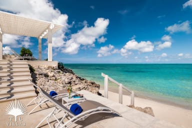 A TC Villas guest favorite! This oceanfront villa features an attractive & modern design - built right on the beautiful north shore of Providenciales, Turks & Caicos. The only oceanfront villa in the exclusive Villas at Blue Mountain neighborhood, MaryJane offers guests their little piece of paradise. The villa’s sleek open-concept living plays beautifully with the immersive tropical paradise surrounding it. Ample interior and exterior seating, including an oceanfront viewing veranda with a small pocket beach, sets the scene for a relaxing experience.