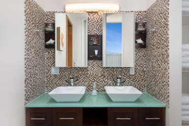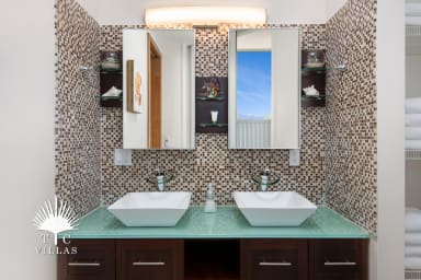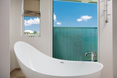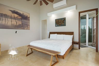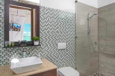Each of the four main bedrooms is a king suite with its own en-suite bathroom and direct water views, offering both comfort and privacy. Two master suites feature luxurious spa-style bathrooms with indoor and outdoor rainfall showers and deep soaking tubs. An optional guest house adds a private fifth bedroom—ideal for in-laws, older teens, or a nanny—rounding out the villa’s spacious yet intimate feel.