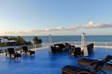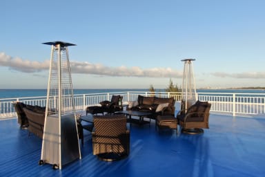 • Rooftop sky lounge with tiki lights, fire pit, and ample lounge seating