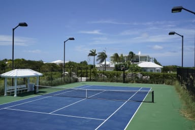 • Private tennis court with automatic ball machine, racquets, and basketball hoop