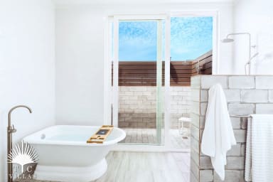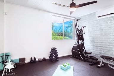 Guests will find two equal master suites with outdoor/indoor showers and opulent porcelain bathtubs. There are two kitchens, a gym, a media room featuring an 85” smart TV, and more. Four bedrooms open directly onto the pool deck and feature stunning beach views; each room has individual AC units and ceiling fans for your comfort. There are laundry facilities on each floor, and the entire villa has been carefully soundproofed for guests to enjoy peace.