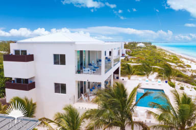 Brand-new beachfront estate on Long Bay, offering 11,500 sq ft of luxury with a mosaic-tiled pool, gym, media room, two kitchens, and outdoor showers. With direct beach access, kayaks, paddleboards, and calm turquoise waters just outside your door, it’s perfect for families or groups seeking a private Caribbean retreat with endless amenities.