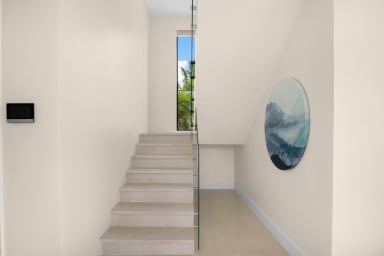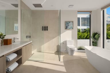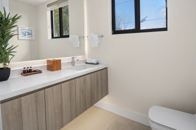 Upon entering Lumiere East, guests are welcomed into a large open-plan living area that blends contemporary luxury with comfort. Expansive windows and glass doors flood the space with natural light and offer seamless access to an impressive terrace. Here, a sizable 40ft x 10ft infinity pool—one of the largest in the area—awaits, set against a backdrop of vibrant tropical gardens that create a tranquil private oasis. Lumiere East is designed for both relaxation and entertainment. The large outdoor space includes eight sunbeds, dining for eight, a BBQ grill, and an indoor/outdoor sound system, perfect for hosting gatherings or enjoying quiet evenings.