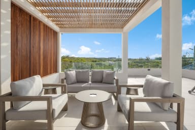 The villa boasts three elegantly furnished bedrooms and three state-of-the-art bathrooms, ensuring privacy and refined comfort. Each bedroom is a serene hideaway; the master room even offers direct access to a private balcony, offering an idyllic spot to relax and soak in the island's mesmerizing views. The expansive rooftop space on the third floor, with its stunning ocean views and ample seating, provides an exceptional setting for enjoying the Caribbean breeze.