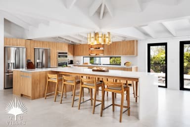 The villa’s expansive communal great room features a plasma TV, sound system, vaulted ceilings, and breathtaking tropical views. Wall-to-wall retractable sliders open onto the poolside terrace, seamlessly blending indoor and outdoor living. The fully equipped kitchen is a chef’s dream, complete with granite countertops, dual refrigerators, and an extended breakfast bar that seats eight. Enjoy outdoor dining on a wooden terrace with a table for ten, a barbecue grill, and ample cushioned seating.
