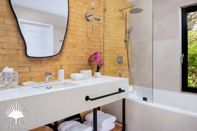 The bedrooms are designed for ultimate comfort, featuring plush bedding, luxury linens, and stunning views. The master suite offers a king-sized bed, an ensuite bathroom with a bath and shower, a TV, and a serene pool view. The second bedroom has a queen bed, an ensuite bath with a shower, and lush garden views. The third bedroom includes two twin beds, perfect for children, while the fourth bedroom features a king-sized bed, TV, and poolside view.
