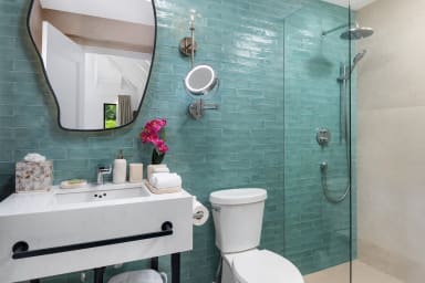 • Bedroom 2: Queen Bed, Ensuite Full Bath with Shower, Air Conditioning, Ceiling Fan, Garden View