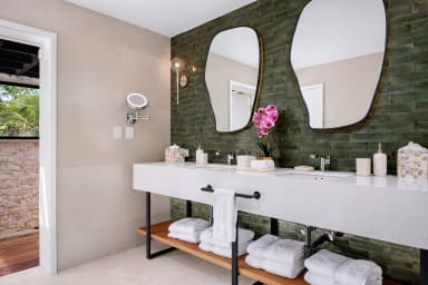The villa’s expansive communal great room features a plasma TV, sound system, vaulted ceilings, and breathtaking tropical views. Wall-to-wall retractable sliders open onto the poolside terrace, seamlessly blending indoor and outdoor living. The fully equipped kitchen is a chef’s dream, complete with granite countertops, dual refrigerators, and an extended breakfast bar that seats eight. Enjoy outdoor dining on a wooden terrace with a table for ten, a barbecue grill, and ample cushioned seating.