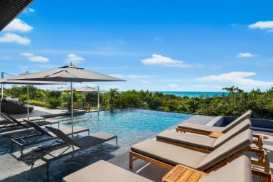 Immerse yourself in the ultimate relaxation with an infinity-edge pool surrounded by lush tropical landscaping. The villa’s common areas boast floor-to-ceiling windows that frame the magnificent pool and oceanfront views. The fully equipped kitchen is perfect for gourmet cooking, featuring stainless steel appliances, modern décor, and a dining table that seats ten. An expansive breakfast bar provides additional seating and counter space for casual dining.