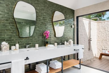 Each bedroom is designed for comfort and luxury. The master suite in the main house includes a king-sized bed, TV, and a luxurious bathroom with a stand-up shower and outdoor bathtub. The second bedroom in the main house offers two twin bunk beds, a TV, and an ensuite bathroom with a shower and tub. Two separate guest pods each feature a king-sized bed, ensuite bathrooms, and poolside access, providing privacy and tranquility.