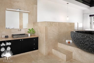 The comfortable and spacious beach-level living room features a 40” Google TV with web capabilities and a fantastic bay view. The kitchen is fully equipped and ready to grill freshly caught fish, or guests can use the BBQ grill on the pool patio. Take a dip in your private plunge pool while enjoying the view. In the morning, the large master bedroom upstairs gives a scenic view of the sunrise over Grace Bay. While enjoying the calm rolling bay at a distance, guests can enjoy soaking in the large granite tub. The upstairs balconies that look over either Grace Bay or Turtle Cove Marina are perfect for enjoying a romantic moment or with a tropical beverage in hand. Invite in the ocean breeze through the master bedroom by opening both patio doors to create a perfect Caribbean retreat.