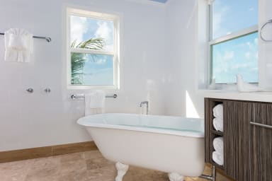 The open chef’s kitchen leads to a covered grilling terrace, complete with an outdoor table -perfect for dining al fresco. The indoor dining table rivals the best table in any fine restaurant and seats ten comfortably. The two indoor seating areas on the ground floor offer vistas of Long Bay through the floor-to-ceiling windows and sliding glass doors, or you can watch television on the 52-inch flat-screen TV. There will be no fighting over bedrooms in this modern, elegantly furnished villa; each of the five bedrooms is furnished with a king-size bed, en-suite bathroom, and spectacular views of the gem-blue waters of Long Bay. Enjoy the stylish decor of this private beachfront estate inside and out.